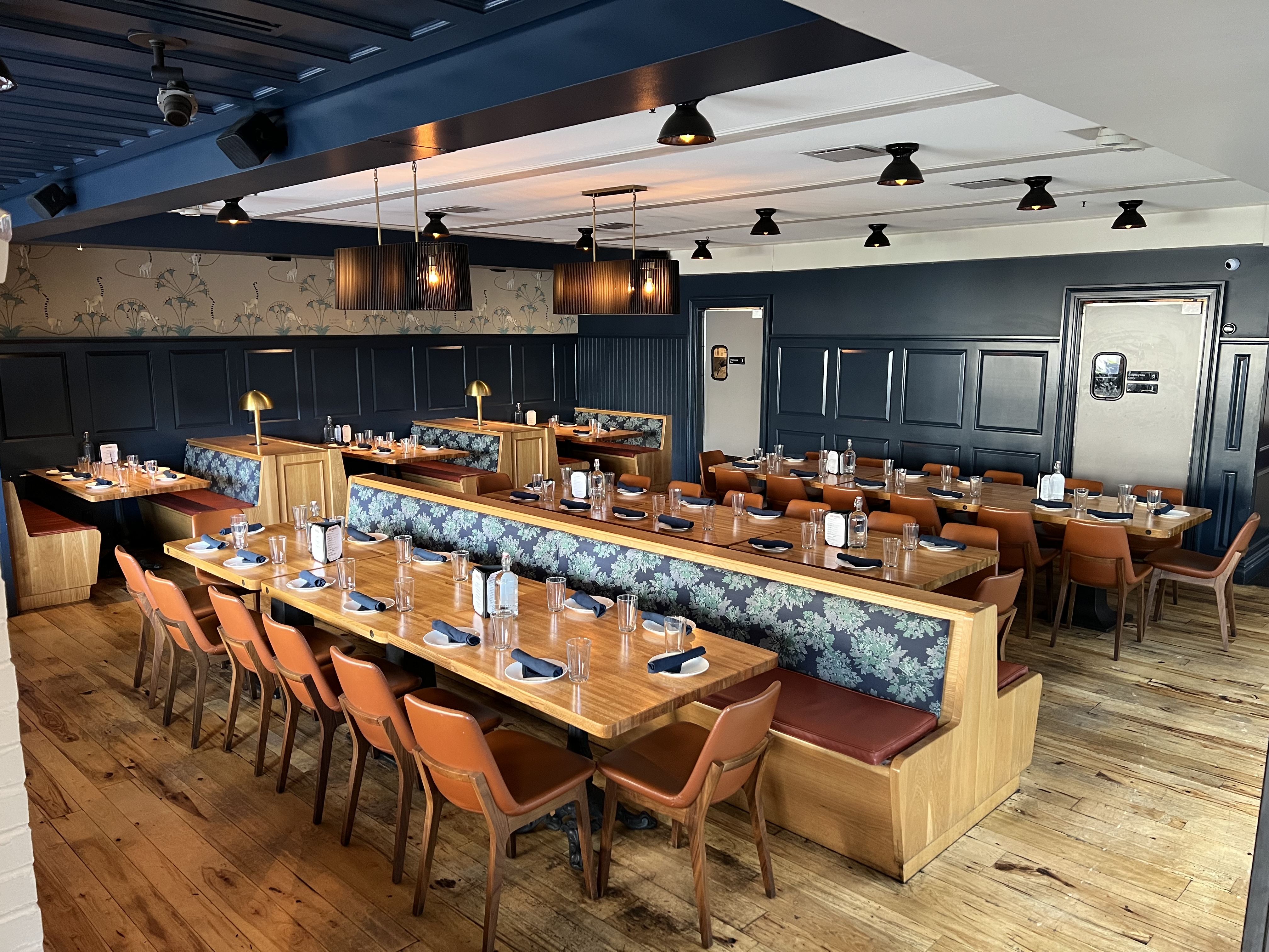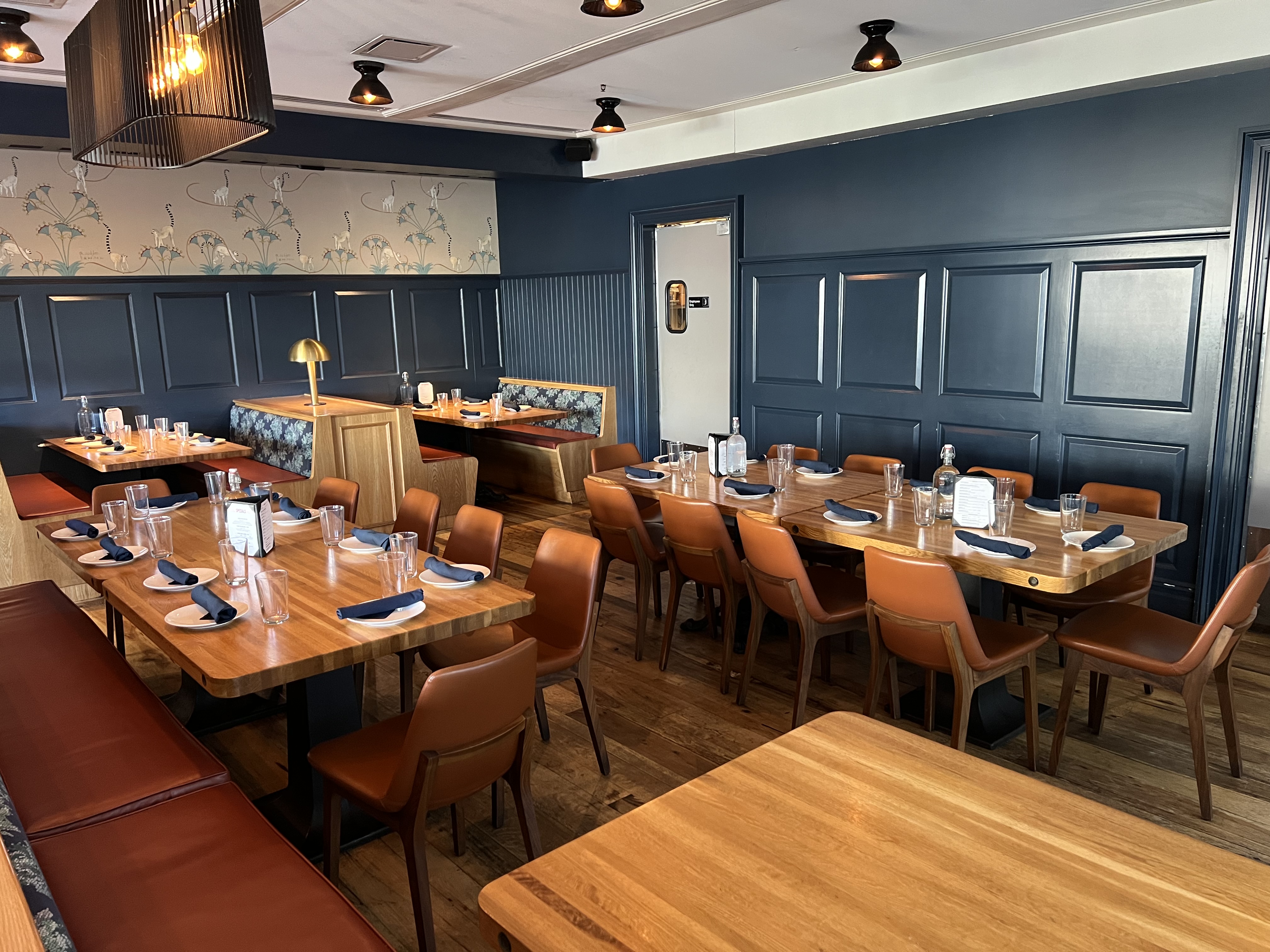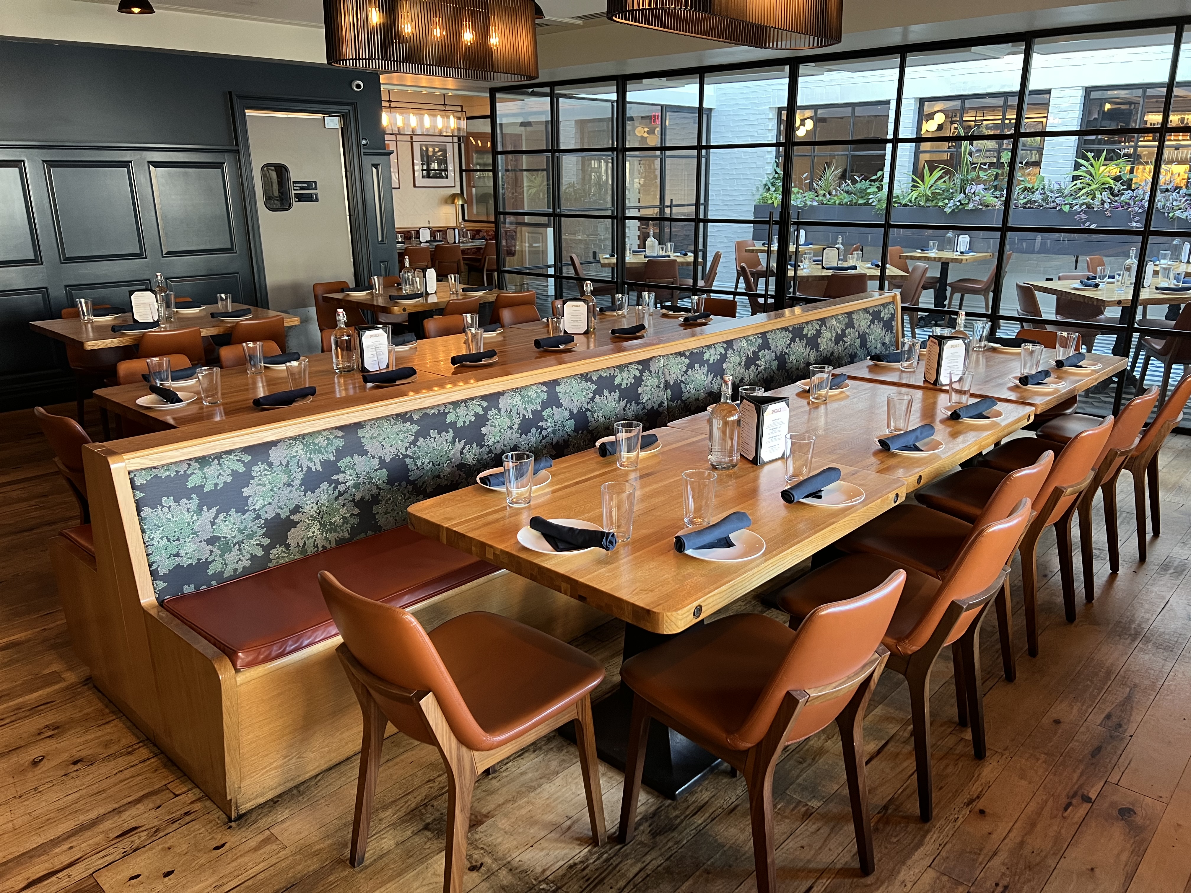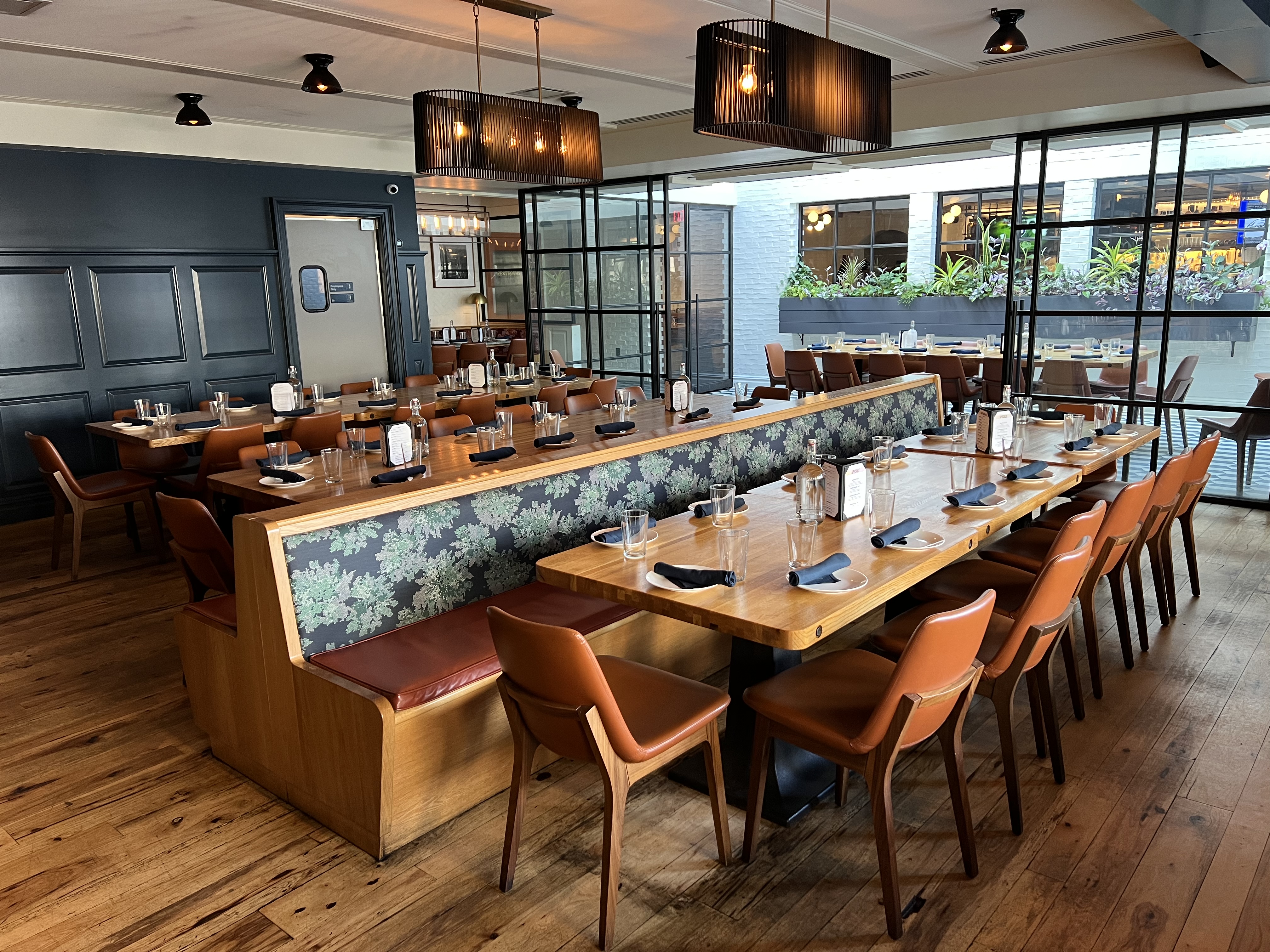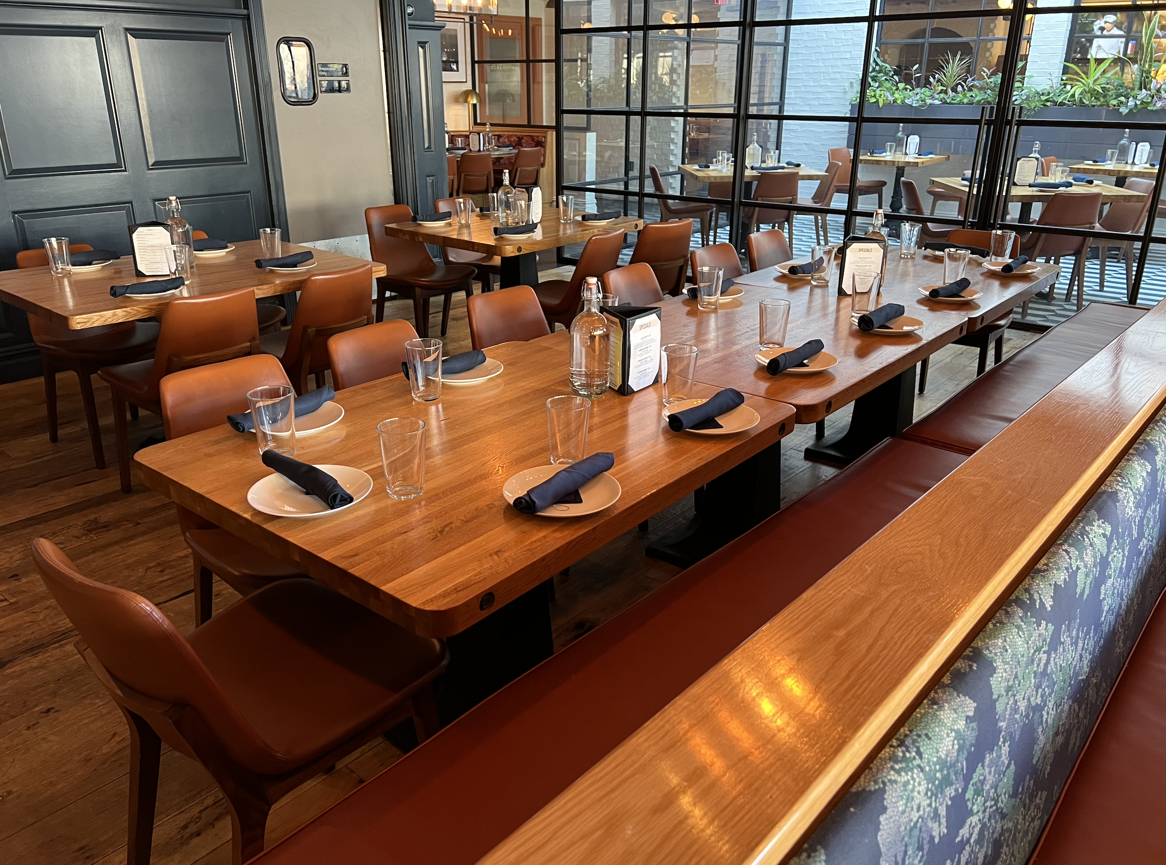 A party of 16-20 guests can be split between two tables, one of which will be half-banquette seating.
